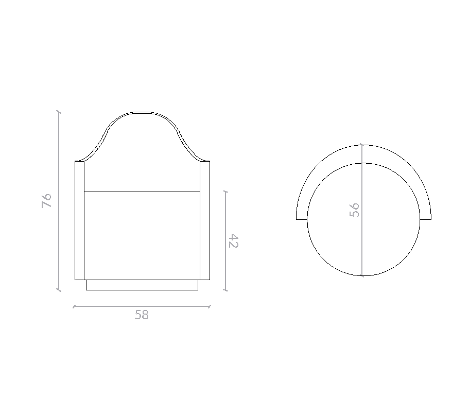 Estructura cilíndrica tapizada e respaldo envolvente. Zócalo en madera chapada en fresno, acabados disponibles según catálogo. Detalle de vivo en todo el contorno.