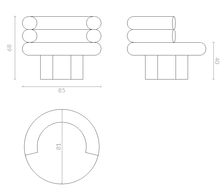 Asiento y respaldo tapizados en formas cilíndricas superpuestas. Base curva chapada en madera de fresno, disponible en distintos acabados según catálogo.