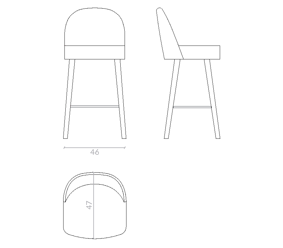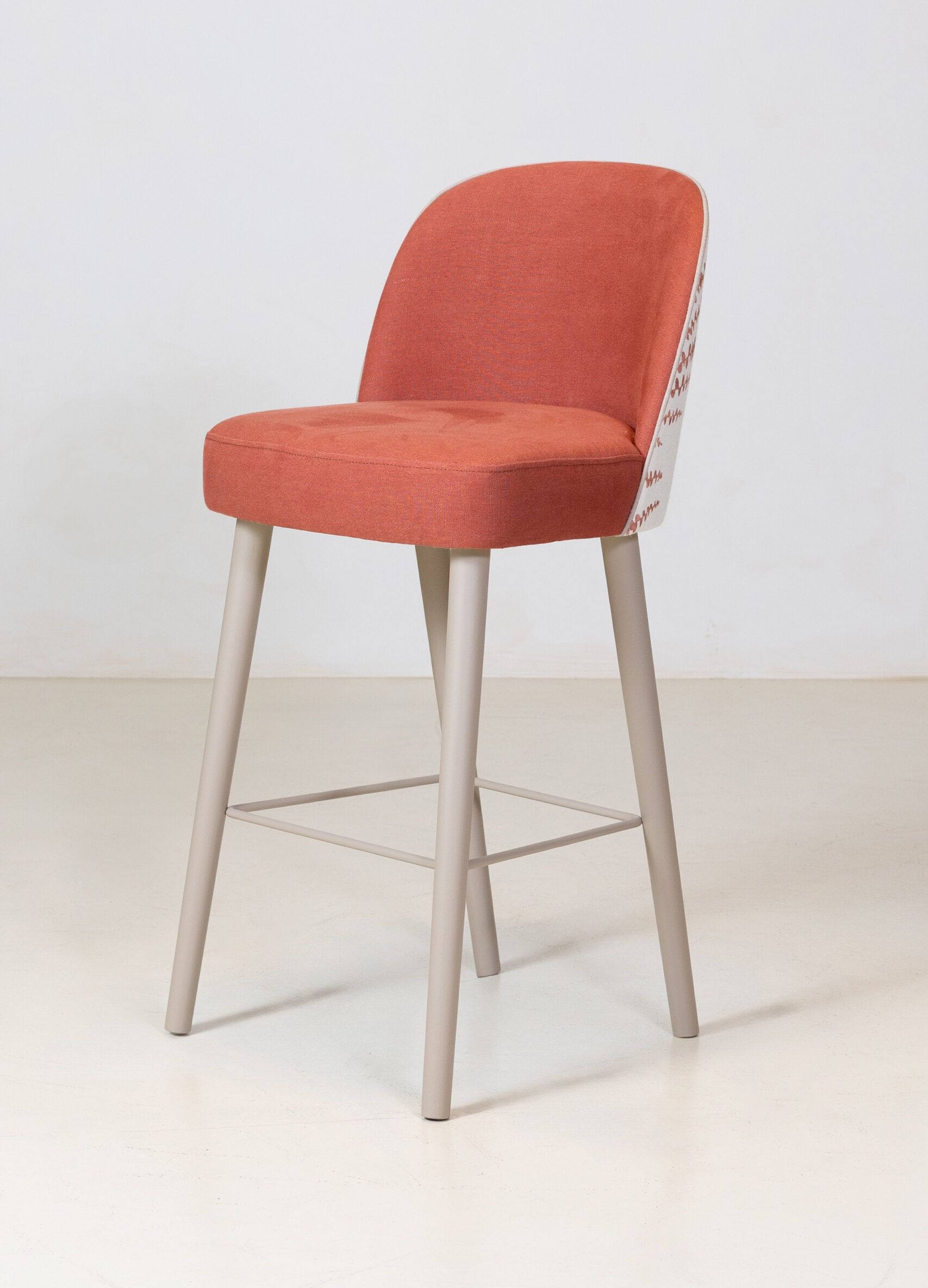 Estructura con patas cónicas en madera de fresno, acabados disponibles según catálogo. Reposapiés en tubular de hierro. Respaldo curvado con posibilidad de tapizado bicolor. Vivo decorativo en el perímetro del respaldo.